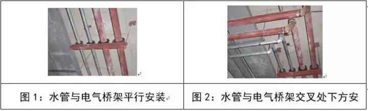 ③ 水管(包括给水、排水、冷冻水、冷却水、冷凝水管道等)与电气桥架、线槽平行安装,则安装间距应大于100mm,在水管与电气桥架、线槽安装位置的交叉处,电气桥架、线槽爬升至管道上方安装。喷淋主管宜安装在风管的上方,与上下喷淋头支管连接根据现场实际情况进行处理。